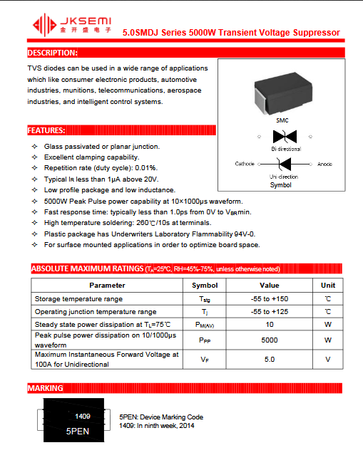 作為業內有名的保護元器件原廠,金開盛在汽車電子領域深耕多年,金開盛電子研發生產的TVS瞬態抑制二極管SMC5K14A國產替代型號5.0SMDJ14A 該料號屬于金開盛TVS管5.0SMDJ系列,具體參數詳情如下: