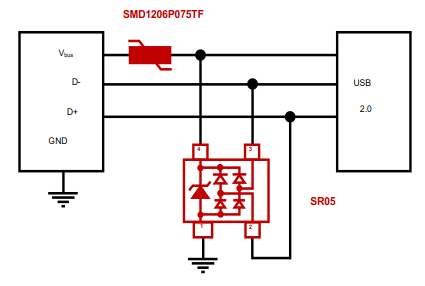 USB2.0提供500Mbps的傳輸速度,本方案采用單顆器件防護,節約空間,保證信號完整性,滿足IEC61000-4-2,等級4,接觸放電8kV,空氣放電15kV。