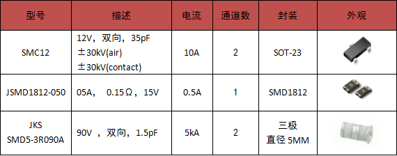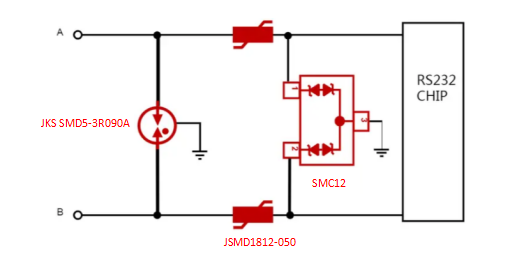該方案用于滿足RS232的浪涌保護,根據(jù)RS232所處環(huán)境選擇合適保護器件,滿足IEC61000-4-5 4kV-8kV不同級別的測試。應(yīng)用到的相關(guān)產(chǎn)品SMC12、JSMD1812-050以及JKS SMD5-3R090A具體參數(shù)如下: